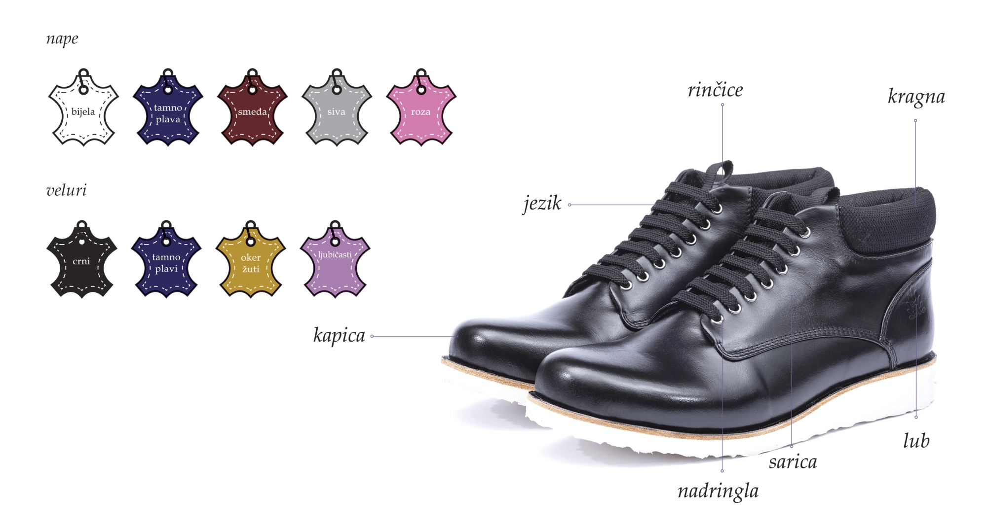 • bijeloj, tamno plavoj, smeđoj, sivoj i rozoj napi
