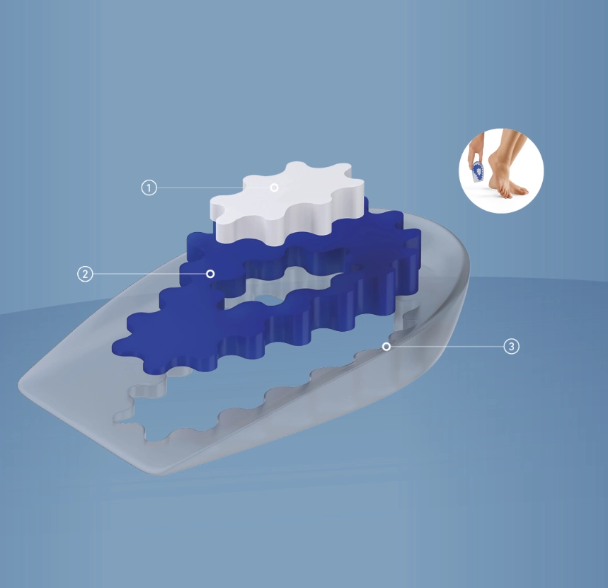 - Posebno oblikovana zona (plavi spot), koja se u svojem stupnju amortizacije nalazi između bijelog i sivog materijala, može dodatno rasteretiti polazište plantarne fascije i uzdužno sljedom vlakana fascije.